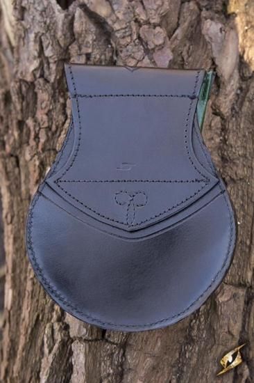 エルフ風をイメージした丸みを帯びたバッグです。革に細工を施されています。表のストラップで中央のホーン上の止め具に止めます。裏側のベルトハンガーを利用してバッグに止めるスタイルです。
